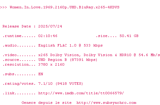 La release Women.In.Love.1969.2160p.UHD.BluRay.x265-4KDVS est en 4K