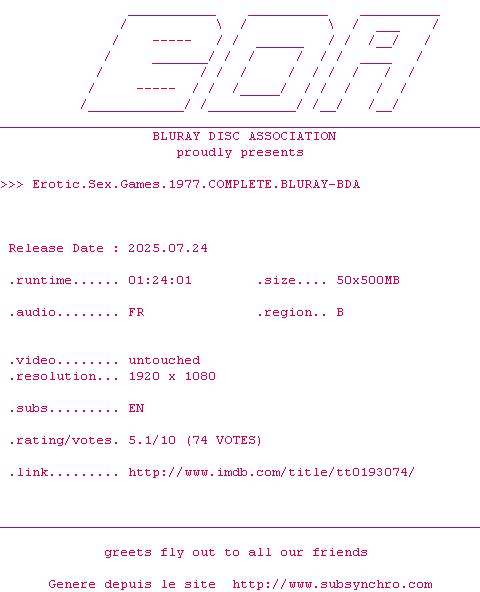 Voir le nfo de la release Erotic.Sex.Games.1977.COMPLETE.BLURAY-BDA