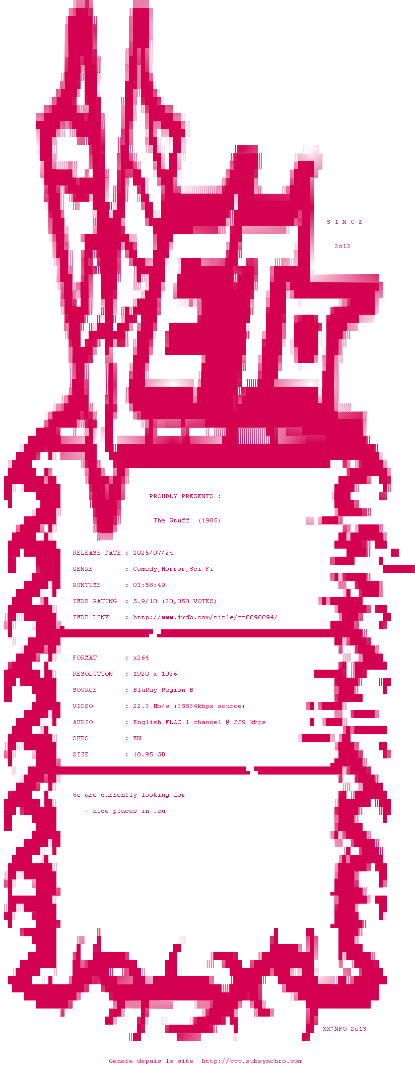 Voir le nfo de la release The.Stuff.1985.PRE.RELEASE.CUT.1080p.BluRay.x264-VETO