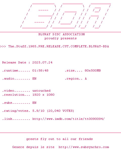 Voir le nfo de la release The.Stuff.1985.PRE.RELEASE.CUT.COMPLETE.BLURAY-BDA