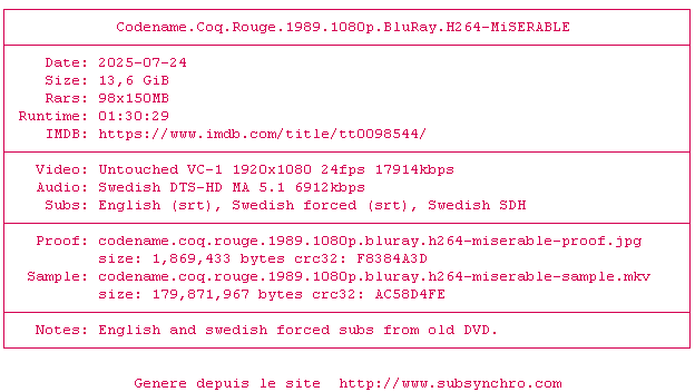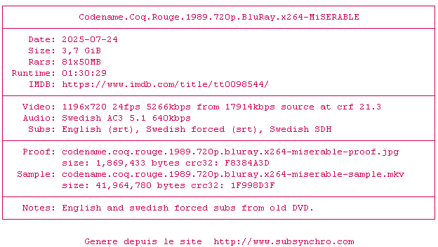 Voir le nfo de la release Codename.Coq.Rouge.1989.1080p.BluRay.H264-MiSERABLE