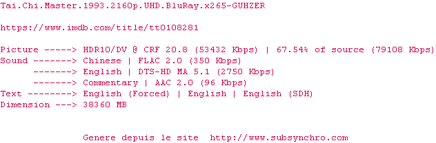 Voir le nfo de la release Tai.Chi.Master.1993.2160p.UHD.BluRay.x265-GUHZER