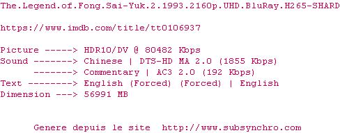 Voir le nfo de la release The.Legend.Of.Fong.Sai-Yuk.2.1993.2160p.UHD.BluRay.H265-SHARD