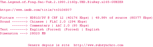 Voir le nfo de la release The.Legend.Of.Fong.Sai-Yuk.2.1993.2160p.UHD.BluRay.x265-GUHZER