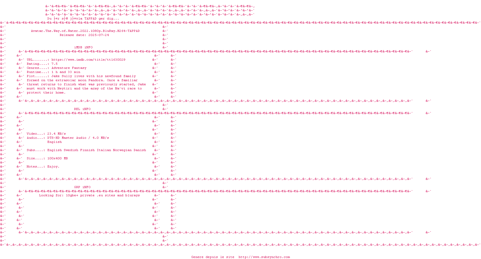 Voir le nfo de la release Avatar.The.Way.Of.Water.2022.1080p.BluRay.H264-TAPPAD