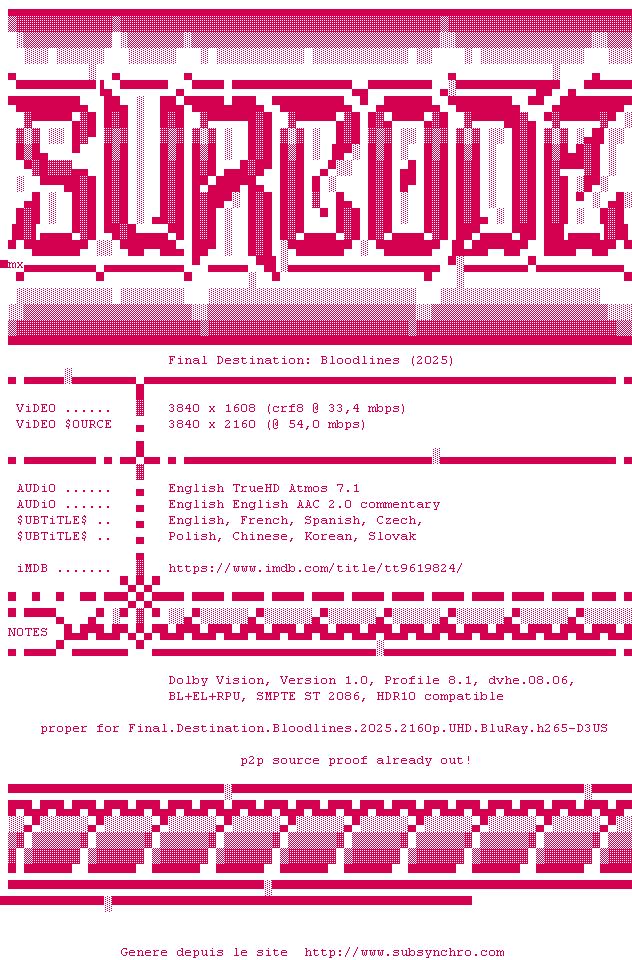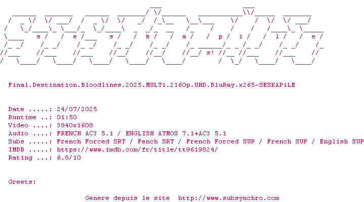 Voir le nfo de la release Final.Destination.Bloodlines.2025.MULTi.2160p.UHD.BluRay.x265-SESKAPiLE