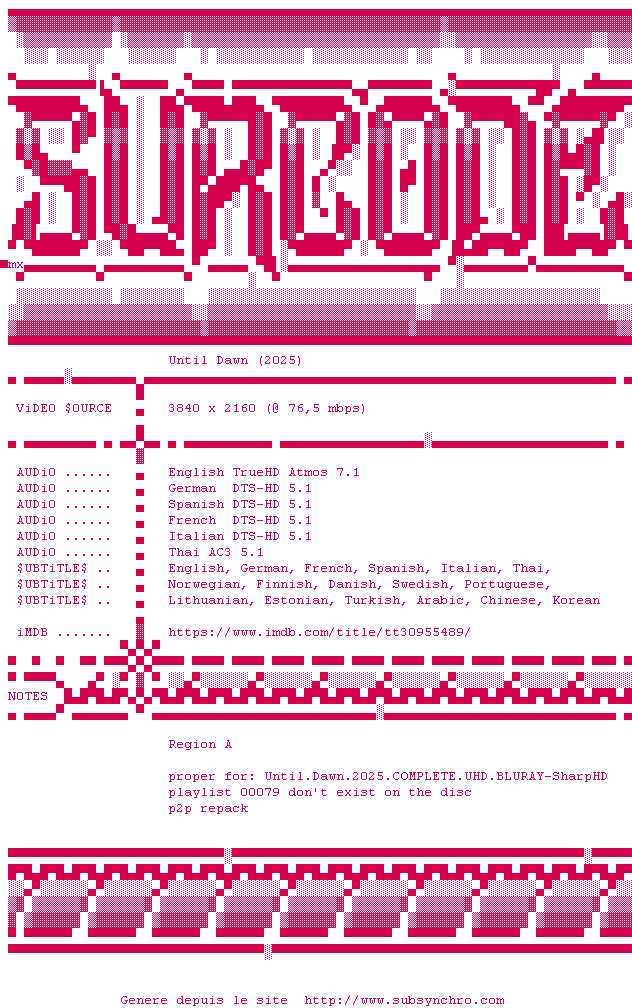 Voir le nfo de la release Until.Dawn.2025.PROPER.COMPLETE.UHD.BLURAY-SURCODE