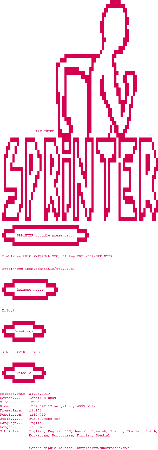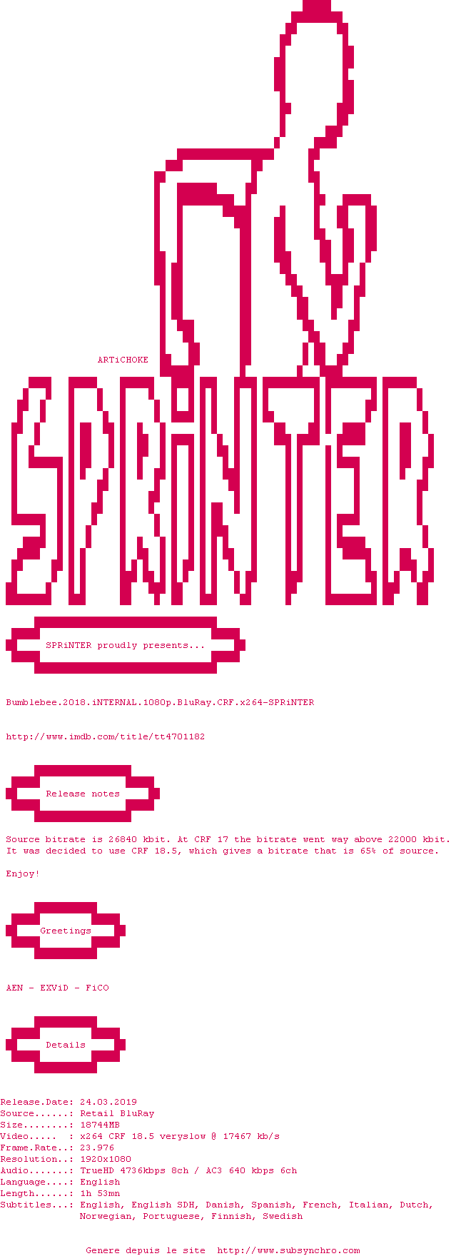Voir le nfo de la release Bumblebee.2018.iNTERNAL.1080p.BluRay.CRF.x264-SPRiNTER