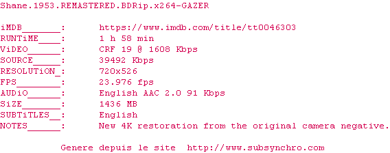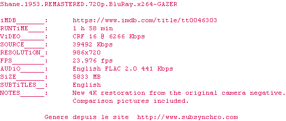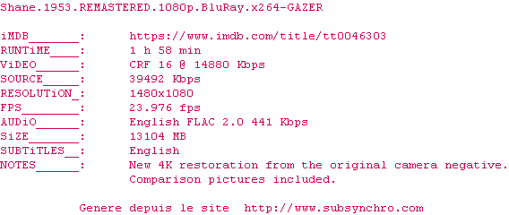 Voir le nfo de la release Shane.1953.REMASTERED.1080p.BluRay.x264-GAZER