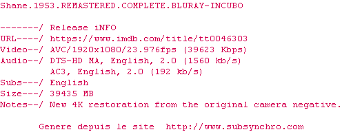 Voir le nfo de la release Shane.1953.REMASTERED.COMPLETE.BLURAY-INCUBO