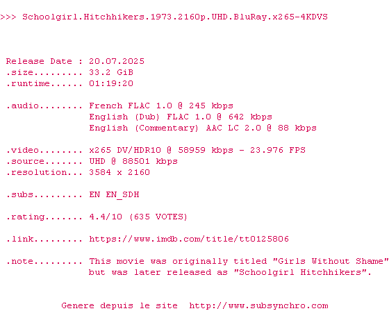 Voir le nfo de la release Schoolgirl.Hitchhikers.1973.2160p.UHD.BluRay.x265-4KDVS