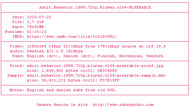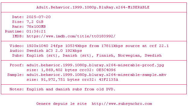 Voir le nfo de la release Adult.Behavior.1999.1080p.BluRay.x264-MiSERABLE