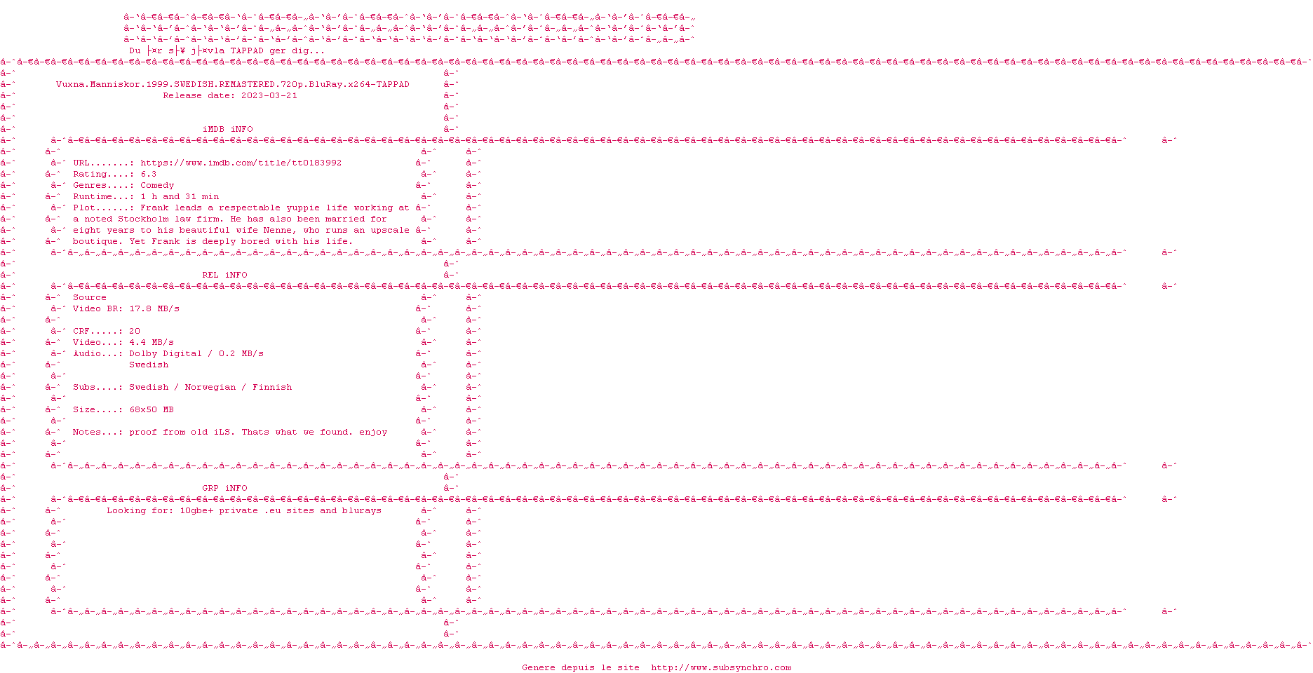 Voir le nfo de la release Vuxna.Manniskor.1999.SWEDISH.REMASTERED.1080p.BluRay.x264-TAPPAD