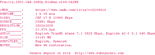 Voir le nfo de la release Frailty.2001.OAR.1080p.BluRay.x264-GAZER