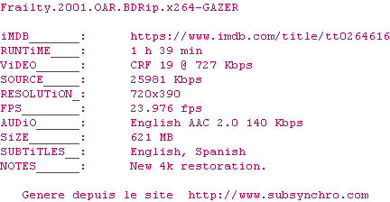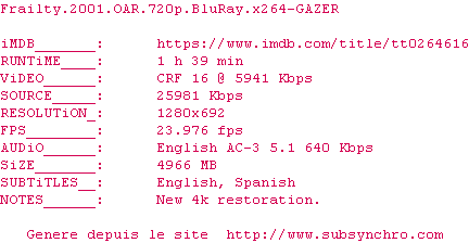 Voir le nfo de la release Frailty.2001.OAR.720p.BluRay.x264-GAZER