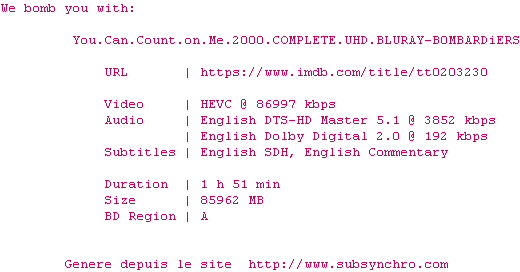 Voir le nfo de la release You.Can.Count.On.Me.2000.COMPLETE.UHD.BLURAY-B0MBARDiERS