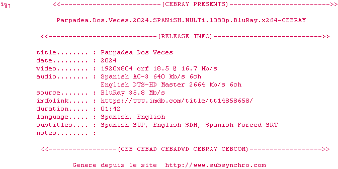 Voir le nfo de la release Parpadea.Dos.Veces.2024.SPANiSH.MULTi.1080p.BluRay.x264-CEBRAY