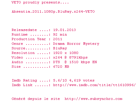 Voir le nfo de la release Absentia.2011.1080p.BluRay.x264-VETO