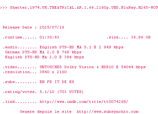 Voir le nfo de la release Shatter.1974.UK.THEATRiCAL.AR.1.66.2160p.UHD.BluRay.H265-WOU