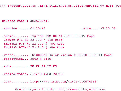 Voir le nfo de la release Shatter.1974.US.THEATRiCAL.AR.1.85.2160p.UHD.BluRay.H265-WOU