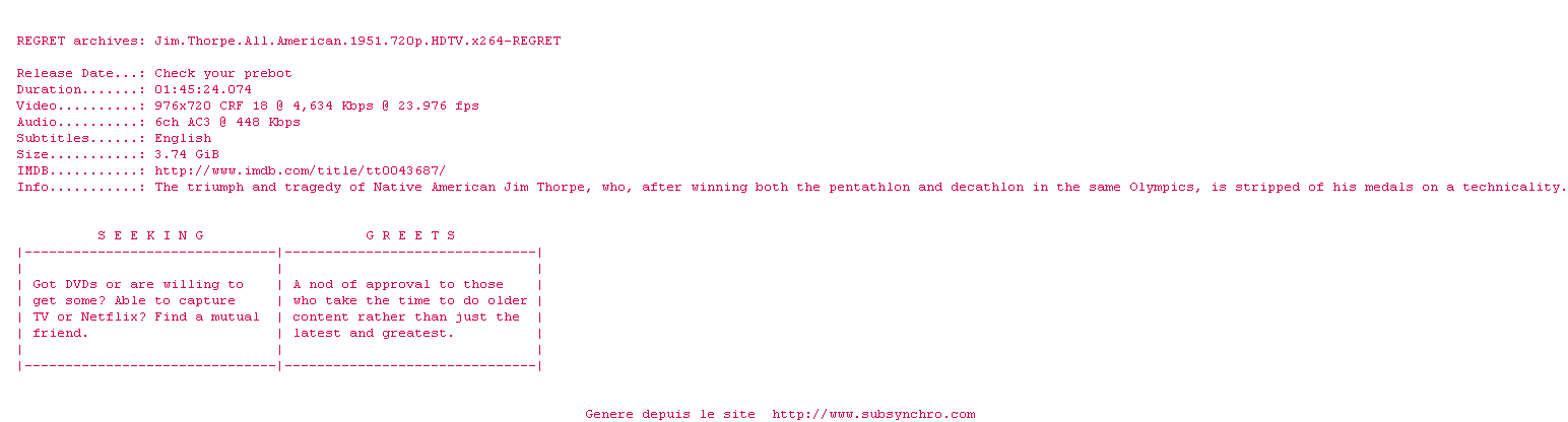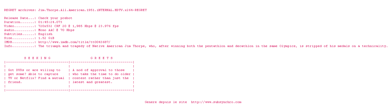 Voir le nfo de la release Jim.Thorpe.All.American.1951.iNTERNAL.HDTV.x264-REGRET