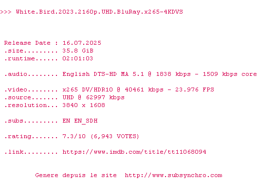 Voir le nfo de la release White.Bird.2023.2160p.UHD.BluRay.x265-4KDVS