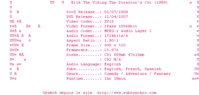 Voir le nfo de la release Erik.The.Viking.1989.DC.DVDRip.XviD.AC3-gx