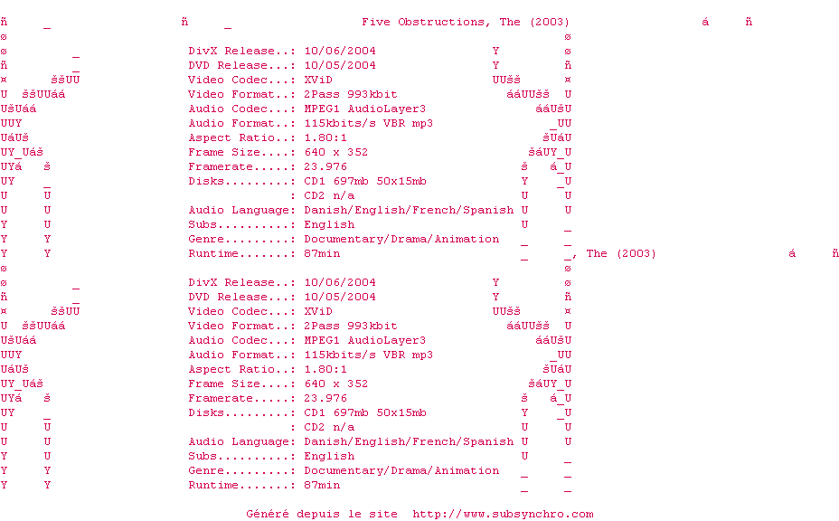 Voir le nfo de la release The.Five.Obstructions.2003.DVDRip.XviD-FRAGMENT