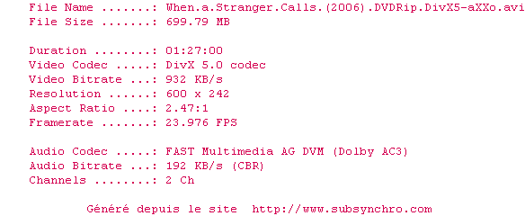 Voir le nfo de la release When.a.Stranger.Calls.2006.DVDRip.DivX5-aXXo