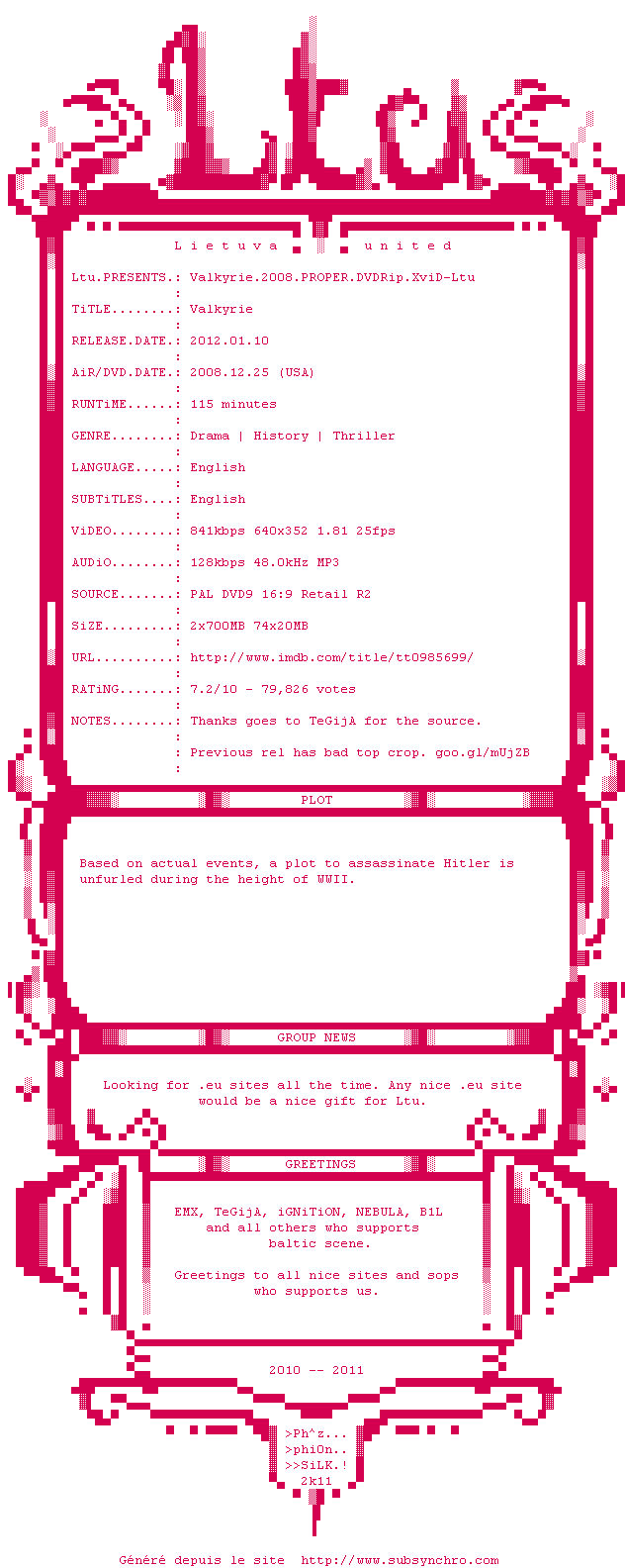 Voir le nfo de la release Valkyrie.2008.PROPER.DVDRip.XviD-Ltu