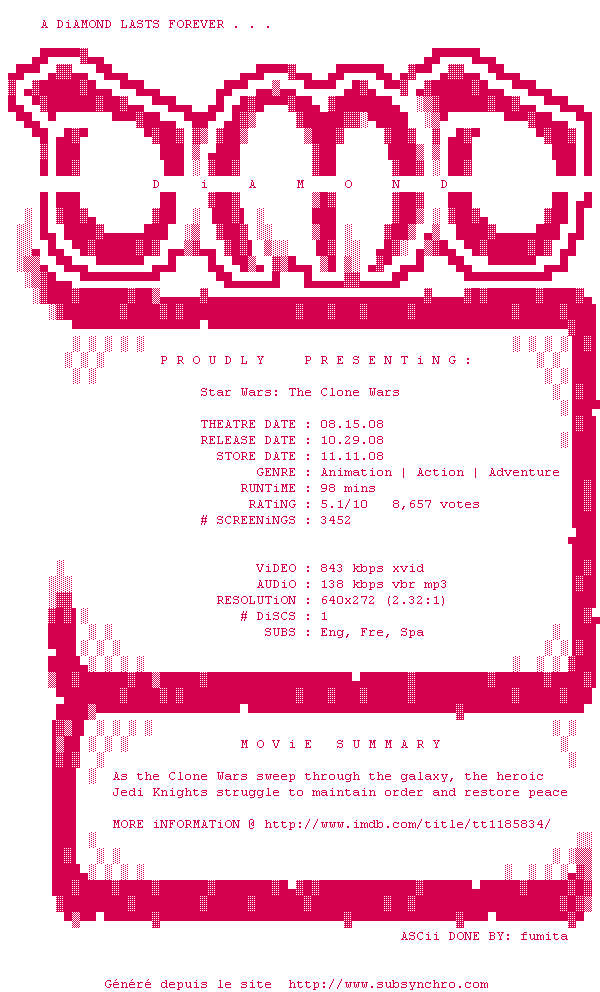 Voir le nfo de la release Star.Wars.The.Clone.Wars.DVDRip.XviD-DiAMOND