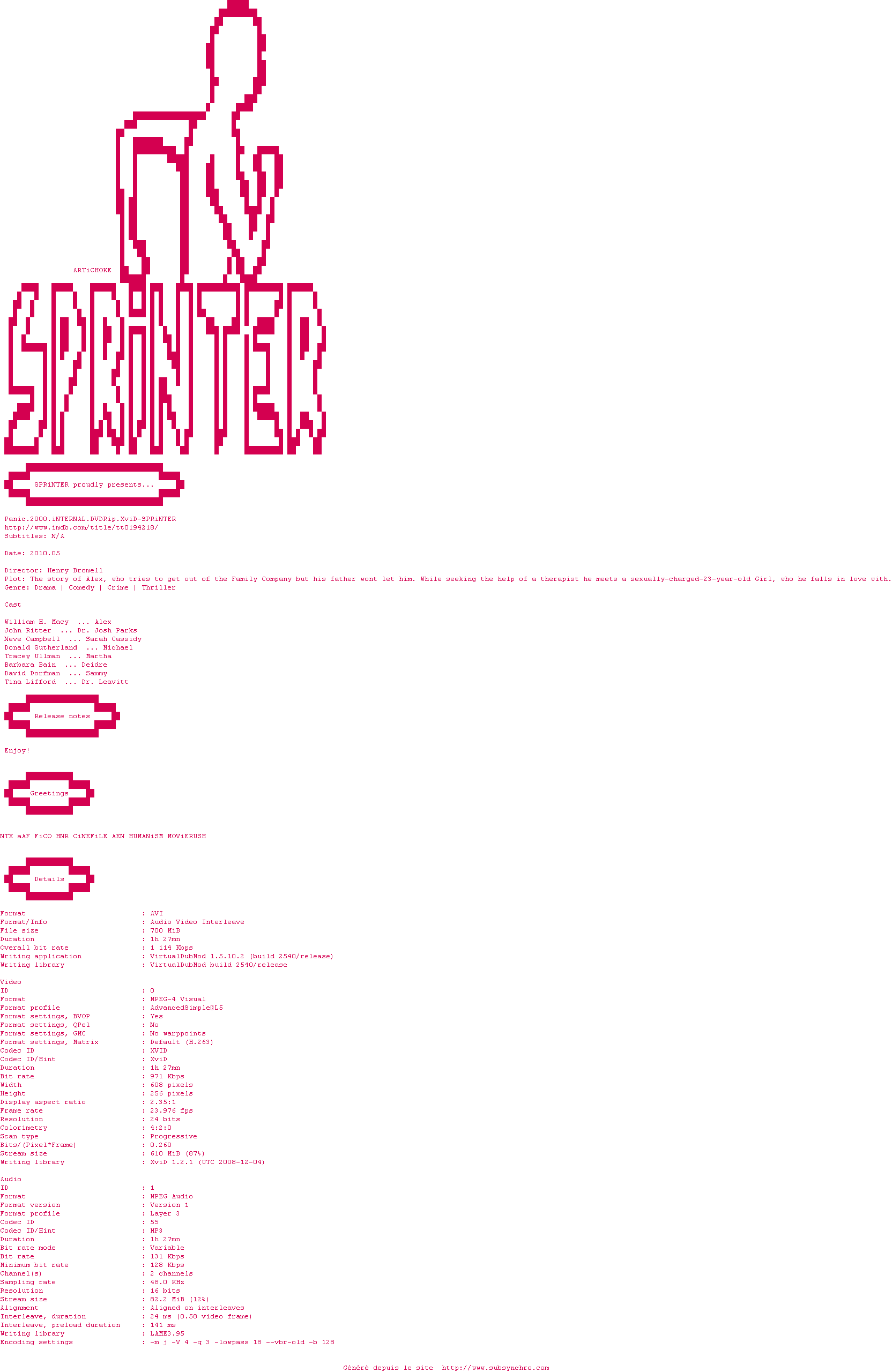Voir le nfo de la release Panic.2000.iNTERNAL.DVDRip.XviD-SPRiNTER