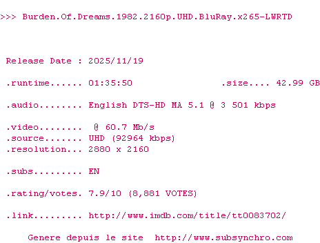 Voir le nfo de la release Burden.Of.Dreams.1982.2160p.UHD.BluRay.x265-LWRTD
