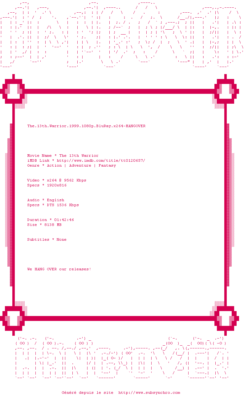 Voir le nfo de la release The.13th.Warrior.1999.1080p.BluRay.x264-HANGOVER