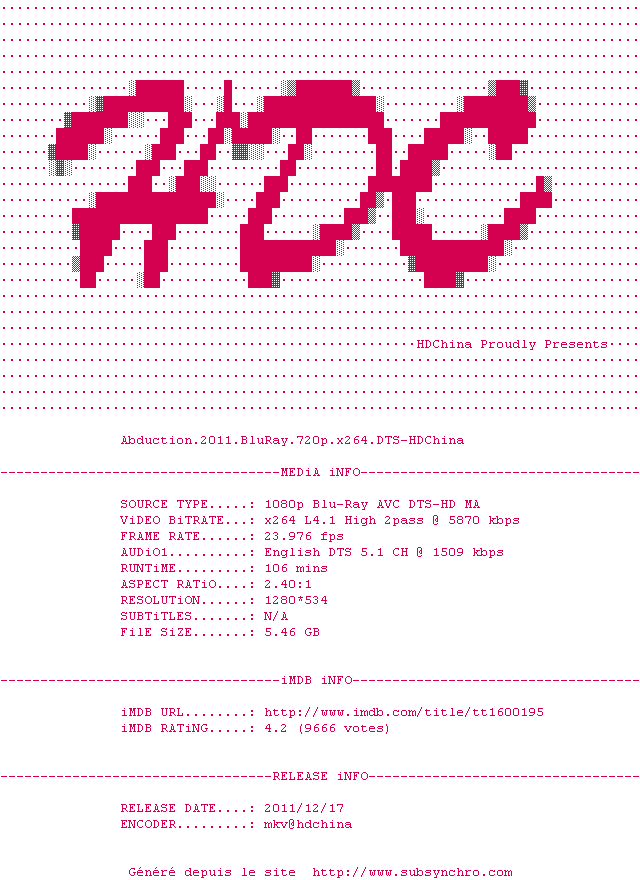 Voir le nfo de la release Abduction.2011.BluRay.720p.x264.DTS-HDChina