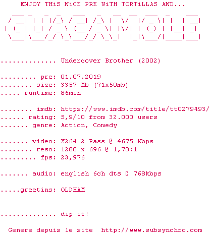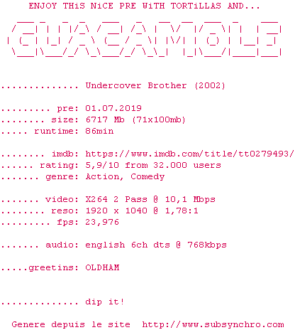 Voir le nfo de la release Undercover.Brother.2002.MULTi.COMPLETE.BLURAY-OLDHAM