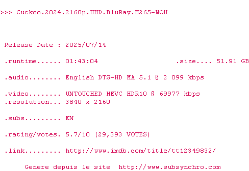 La release Cuckoo.2024.2160p.UHD.BluRay.H265-WOU est en 4K