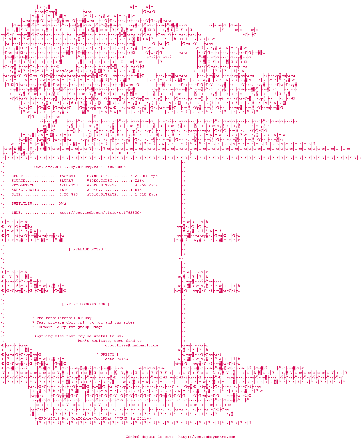 Voir le nfo de la release One.Life.2011.720p.BluRay.x264-BiRDHOUSE