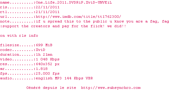Voir le nfo de la release One.Life.2011.DVDRiP.XviD-UNVEiL