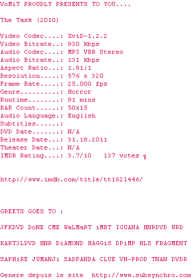Voir le nfo de la release The.Task.2010.DVDRip.XviD-VoMiT