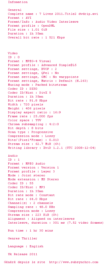 Voir le nfo de la release 7Lives.2011.DVDRip.Xvid-NoGRP