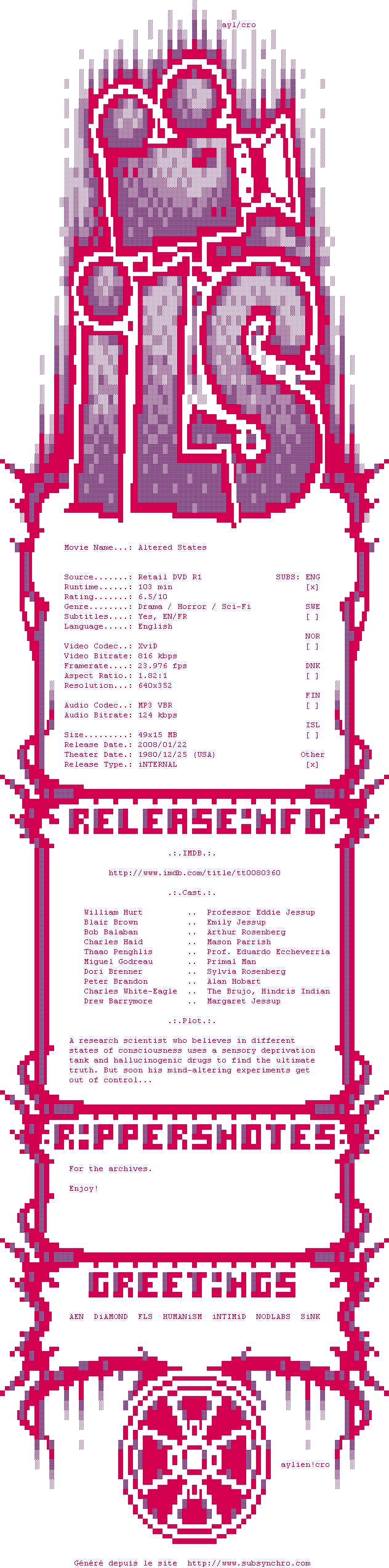 Voir le nfo de la release Altered.States.1980.iNTERNAL.DVDRip.XviD-iLS