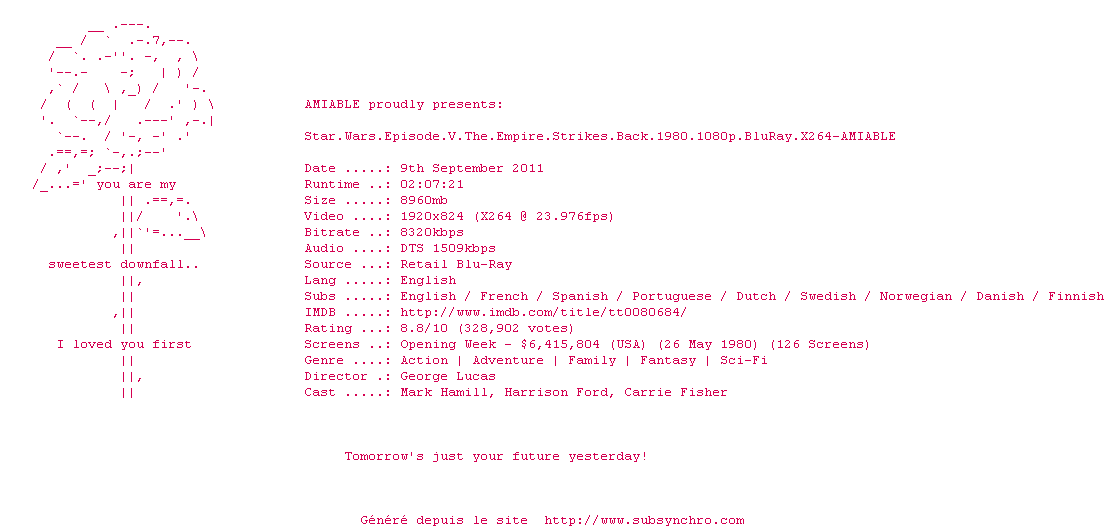 Voir le nfo de la release Star.Wars.Episode.III.Revenge.of.the.Sith.2005.INTERNAL.1080p.BluRay.X264-AMIABLE