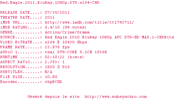 Voir le nfo de la release Red.Eagle.2011.BluRay.1080p.DTS.x264-CHD