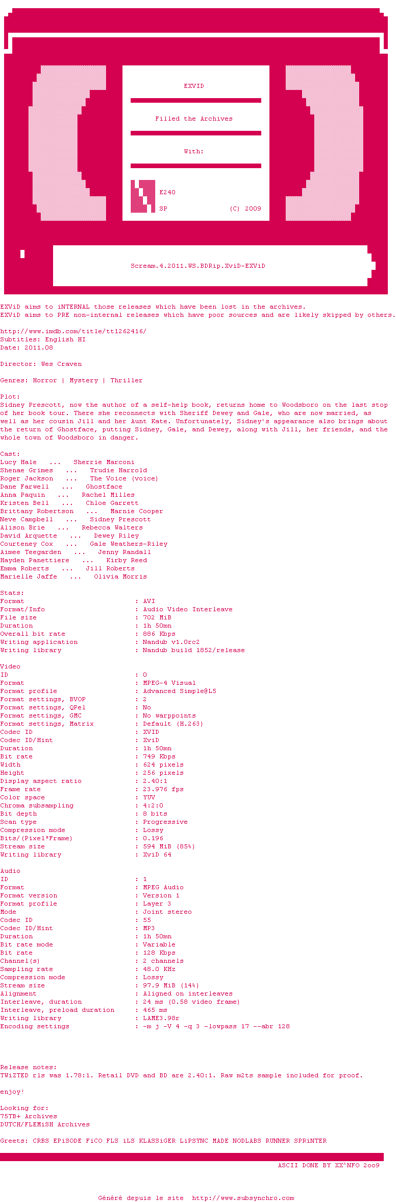 Voir le nfo de la release Scream.4.2011.WS.BDRip.XviD-EXViD