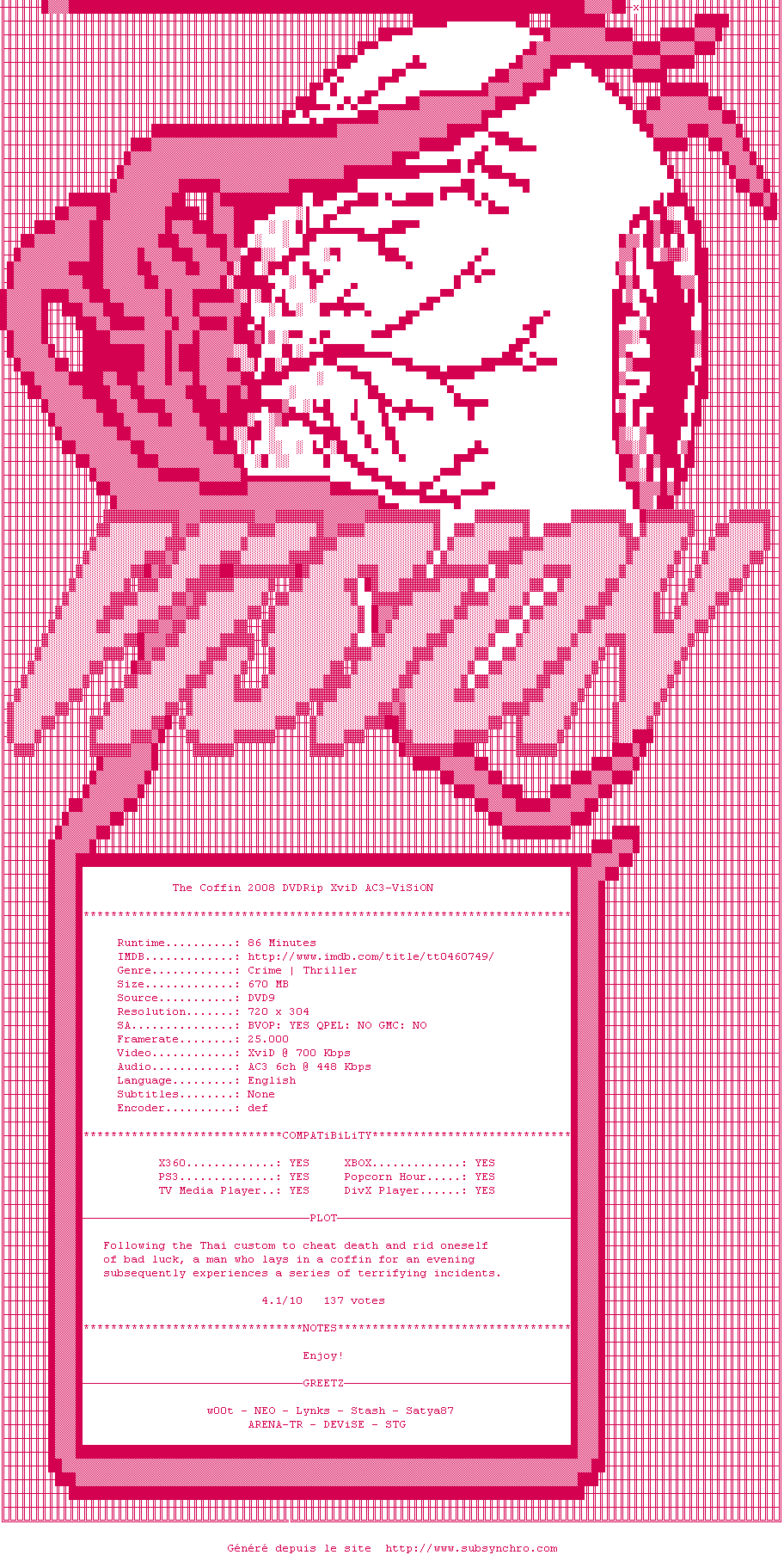 Voir le nfo de la release The.Midnight.Meat.Train.2008.R5.Xvid-Noir