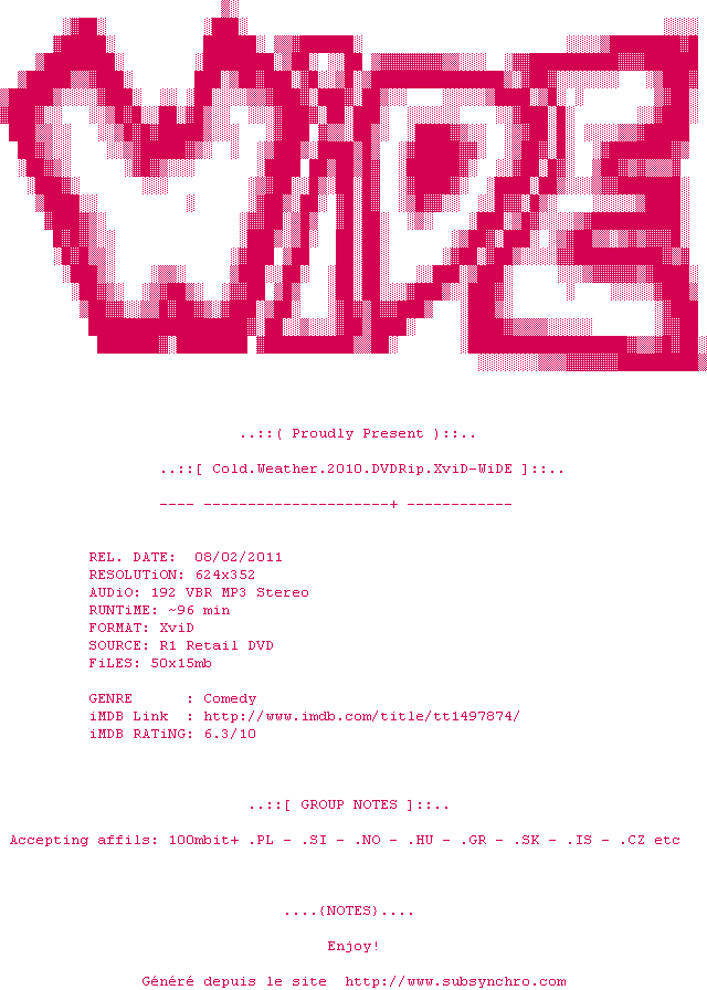 Voir le nfo de la release Cold.Weather.2010.DVDRip.XviD-WiDE