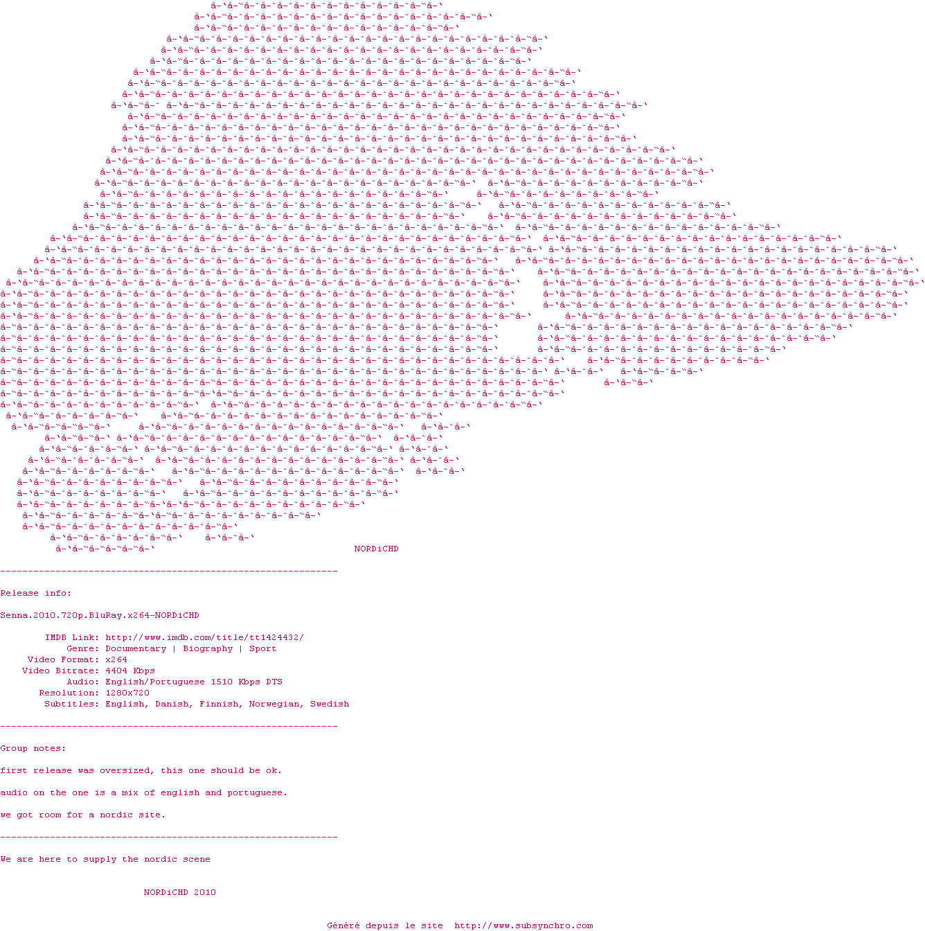 Voir le nfo de la release Senna.2010.RERiP.720p.BluRay.x264-NORDiCHD