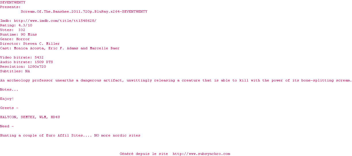 Voir le nfo de la release Scream.Of.The.Banshee.2011.720p.BluRay.x264-SEVENTWENTY