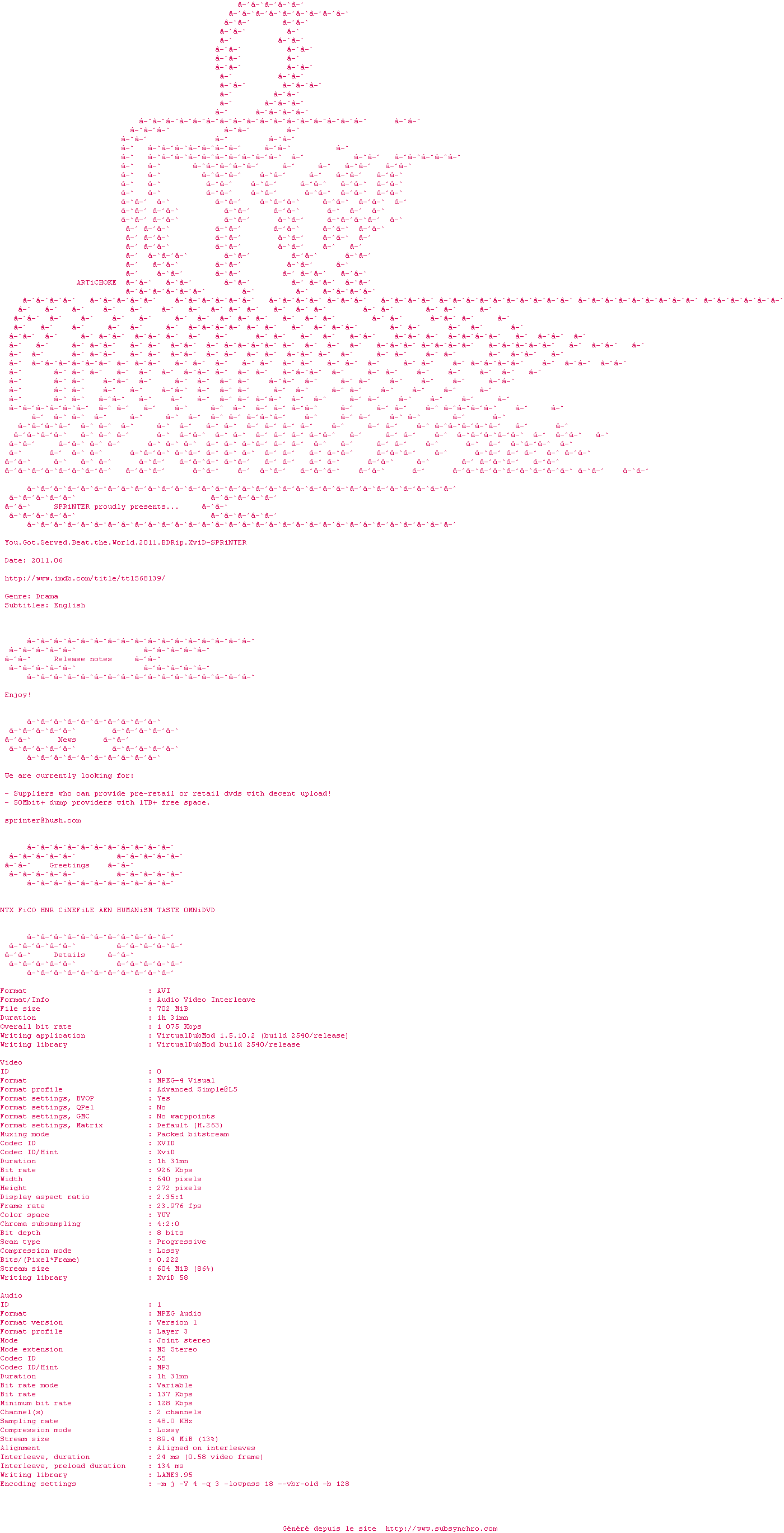 Voir le nfo de la release You.Got.Served.Beat.the.World.2011.BDRip.XviD-SPRiNTER
